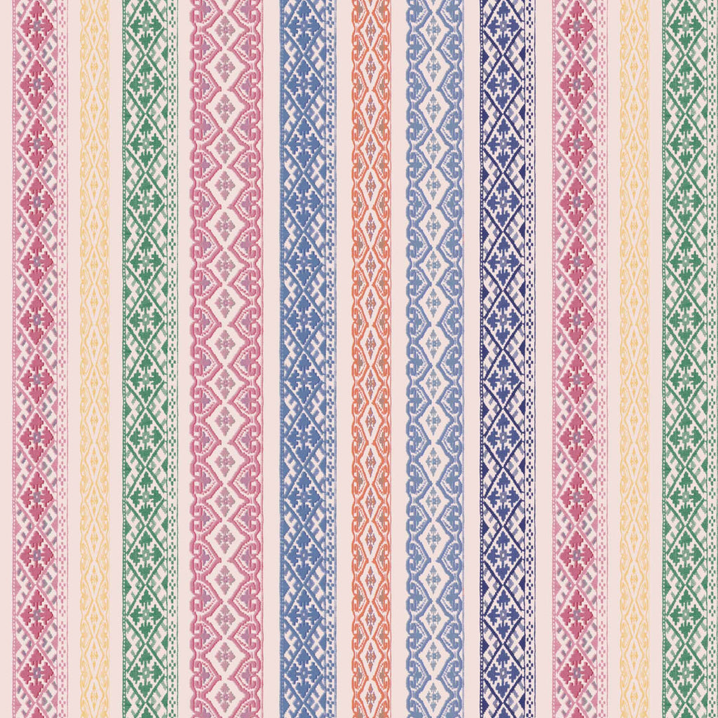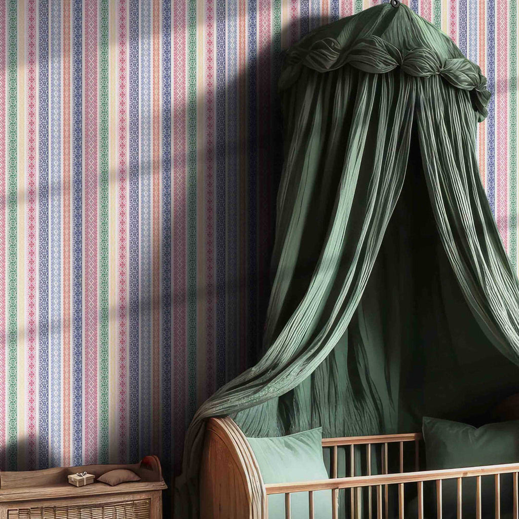 This multicoloured striped wallpaper was inspired by an antique hand-stitched textile featuring an intricate geometric design, now reimagined as a vibrant yet bohemian striped wallpaper. This unique wall covering features an intricate cross-stitch pattern, delicately crafted to capture the essence of traditional craftsmanship. The combination of bold, playful coloured stripes and the detailed pattern brings a lively yet sophisticated energy to any room.